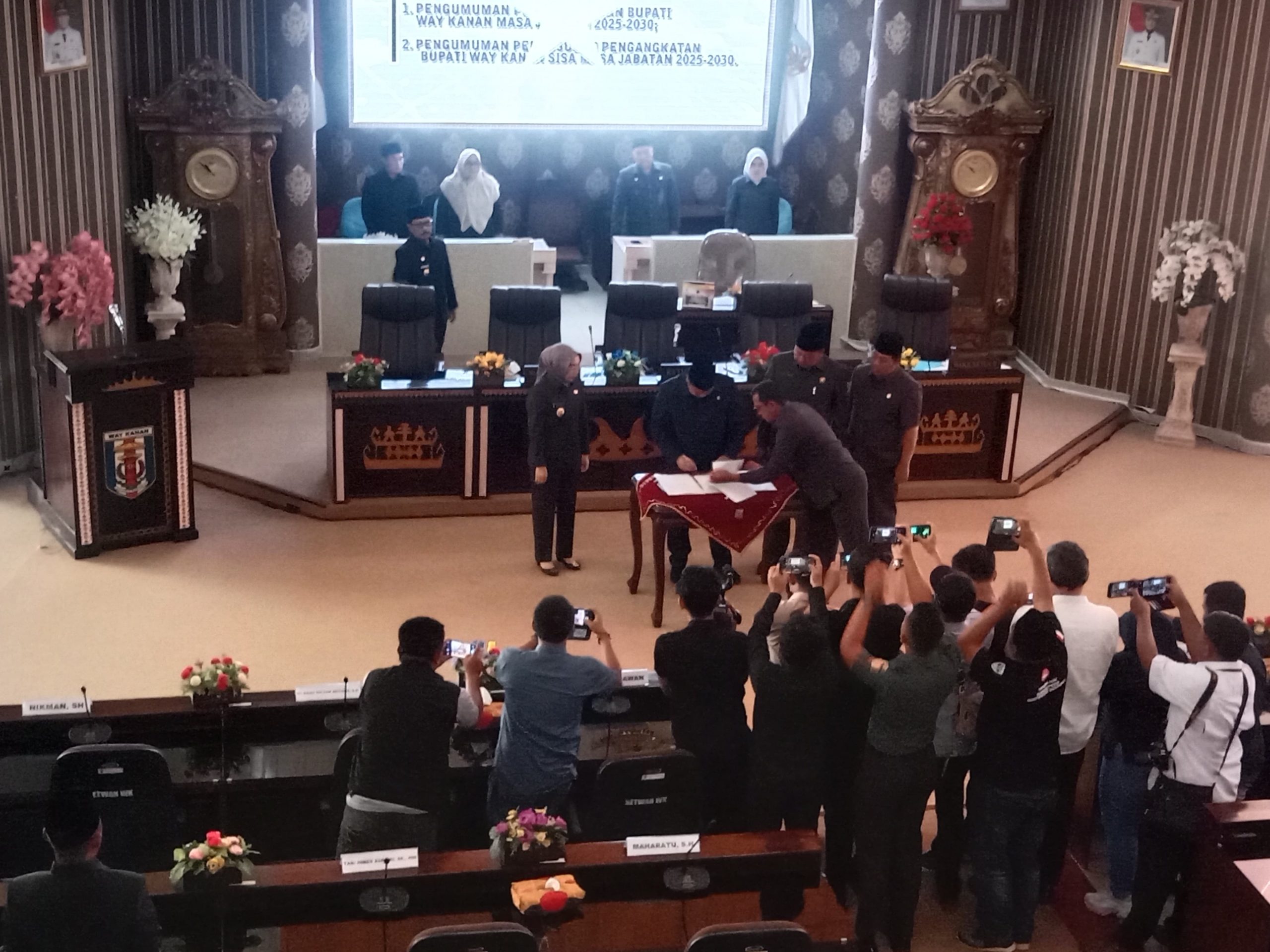 “Untuk memenuhi ketentuan peraturan itu, maka rapat paripurna ini diusulkan pengangkatan dan pengesahan Plt Bupati menjadi Bupati Way Kanan sisa masa jabatan 2025 – 2030,” Ungkapnya