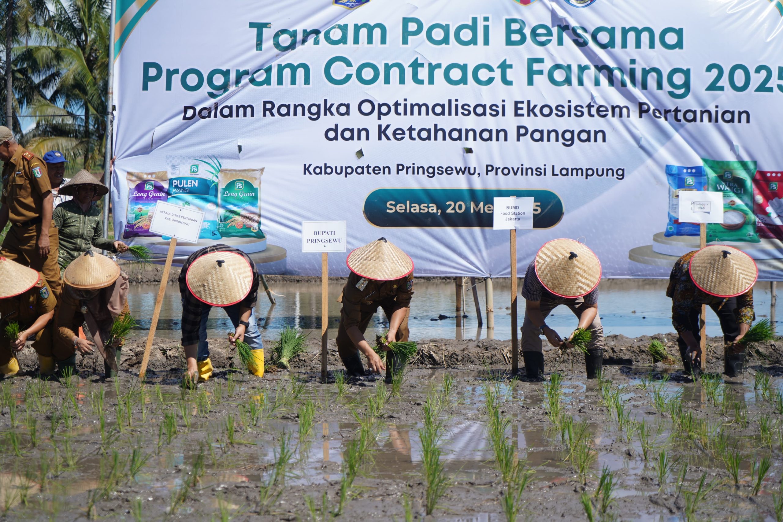 PRINGSEWU – Dalam rangka optimalisasi ekosistem pertanian dan ketahanan pangan, Pemerintah Kabupaten Pringsewu, Provinsi Lampung dan Badan Usaha Milik Daerah (BUMD) Pemerintah Provinsi Daerah Khusus Jakarta, PT. Food Station (FS), menjalin kerjasama program Contract Farming. Penandatanganan nota kesepahaman sekaligus penanaman padi bersama dilakukan di areal persawahan Pekon Candiretno, Kecamatan Pagelaran, Kabupaten Pringsewu, Selasa (20/5/2025).