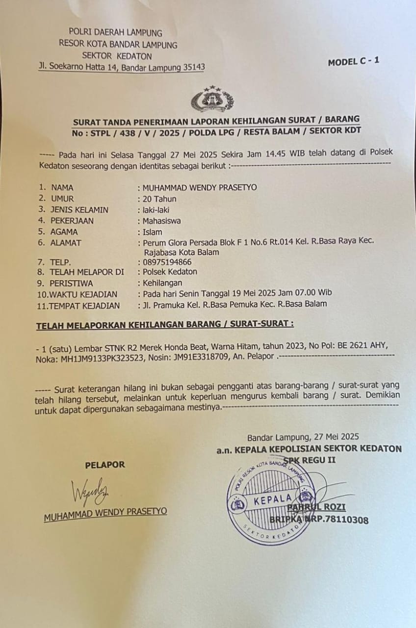 Dalam laporan yang tercatat dengan nomor STPL/438/V/2025/POLDA LPG/RESTA BALAM/SEKTOR KDT, Wendy menyampaikan bahwa ia kehilangan satu lembar STNK R2 untuk sepeda motor Honda Beat berwarna hitam tahun 2023 dengan nomor polisi BE 2621 AHY. Motor tersebut memiliki nomor rangka MH1JM9133PK323523 dan nomor mesin JM91E3318709.