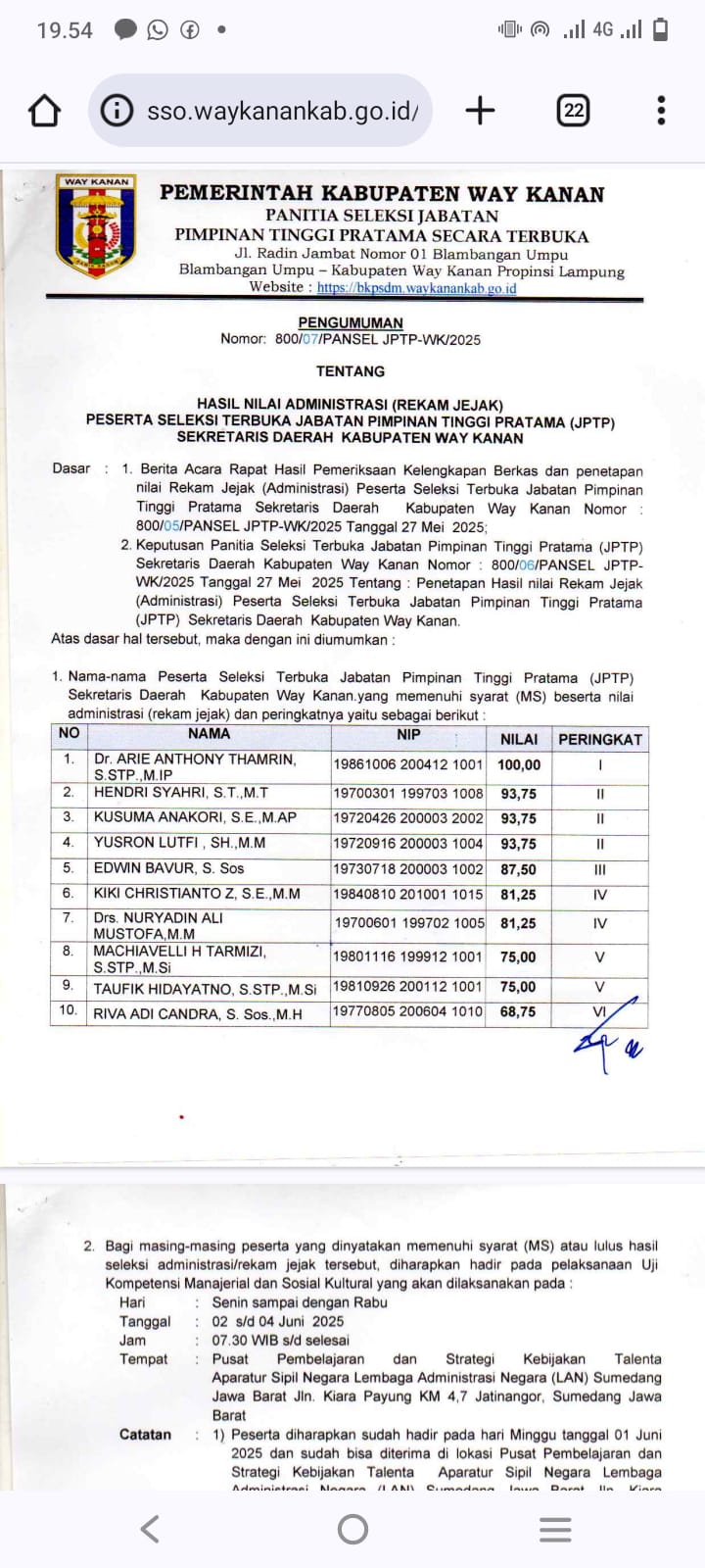 Dari hasil seleksi tersebut, nama Dr. Arie Anthony Thamrin, S.STP., M.IP., CGCAE., CGRE yang saat ini menjabat sebagai Penjabat (Pj) Sekretaris Daerah Kabupaten Way Kanan, menempati peringkat pertama dengan nilai sempurna: 100.