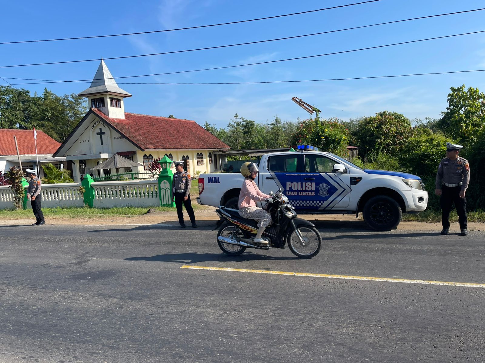 Pesawaran – Dalam upaya menjaga ketertiban dan keamanan masyarakat serta menjamin kelancaran arus lalu lintas, Satuan Lalu Lintas (Satlantas) Polres Pesawaran melaksanakan kegiatan pengamanan ibadah Minggu umat Kristen di Gereja GPIB Immanuel, Kecamatan Gedong Tataan, Kabupaten Pesawaran, Minggu (08/06/2025).