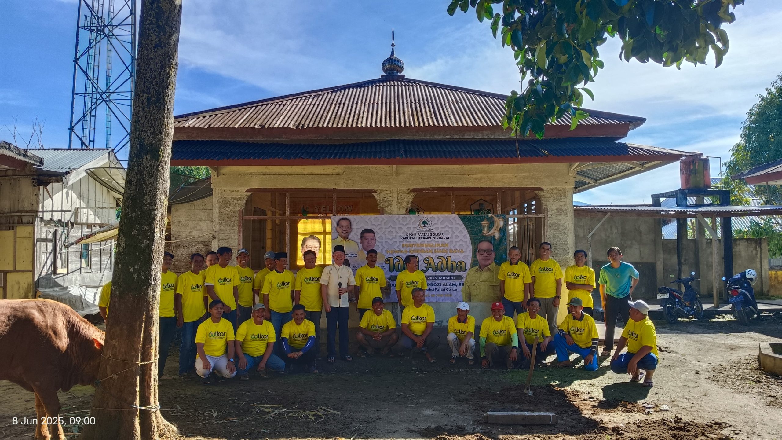 Lampung Barat- DPD Partai Golkar Kabupaten Lampung Barat melaksanakan penyembelihan hewan qurban berupa satu ekor sapi yang berasal dari Anggota DPR RI Fraksi Golkar Dapil Lampung Aprozi Alam, di Kantor Partai Golkar Kabupaten Lampung Barat Pekon Gunung Sugih Kecamatan Balik Bukit Lampung Barat, minggu (08/06/2025).