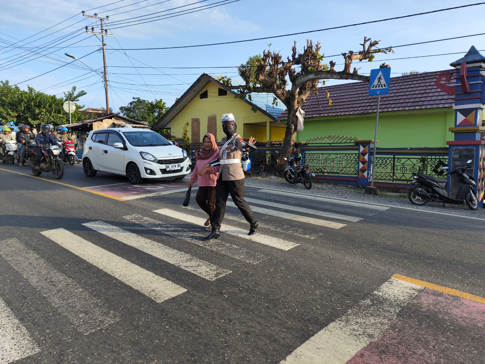 Pesawaran – Pagi yang ramai di sekitar SD 26 Bernung, Kecamatan Gedong Tataan, Kabupaten Pesawaran, terasa lebih aman dengan kehadiran Briptu Nabila, Polwan Satlantas Polres Pesawaran. Pada Selasa (15/7/2025), Briptu Nabila terlihat turun langsung mengatur arus lalu lintas dan membantu para pelajar serta warga yang hendak menyebrangi Jalan Lintas Barat Pesawaran.