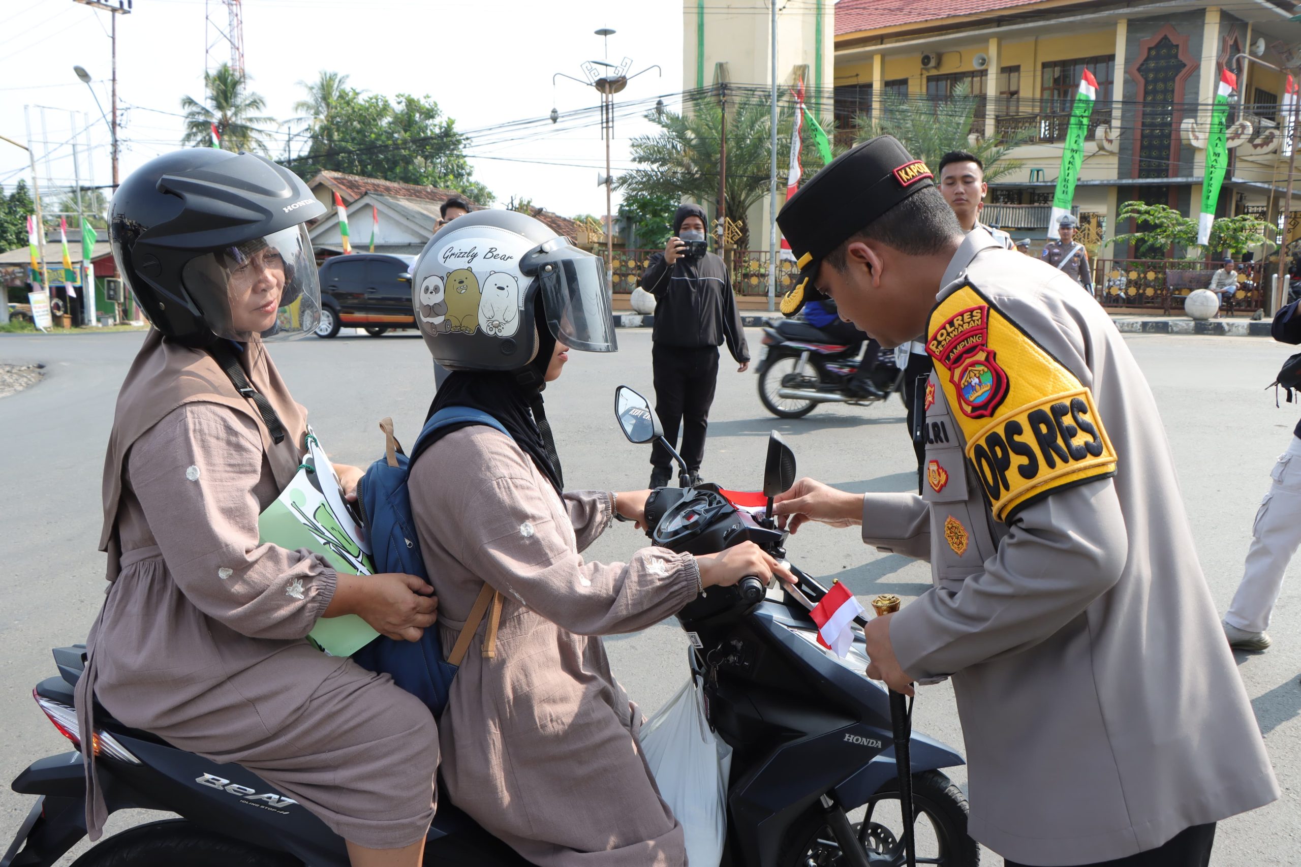 Pesawaran – Menyambut Hari Ulang Tahun (HUT) ke-80 Kemerdekaan Republik Indonesia, Polres Pesawaran bersama sejumlah instansi pemerintah daerah menggelar aksi pembagian bendera Merah Putih kepada pengguna jalan. Kegiatan yang berlangsung di Simpang Tugu Pengantin, Jalan Ahmad Yani, Desa Gedong Tataan ini bertujuan menumbuhkan semangat nasionalisme dan cinta tanah air di kalangan masyarakat.