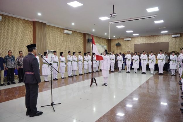 PRINGSEWU– Pasukan Pengibar Bendera Pusaka (Paskibraka) Kabupaten Pringsewu Tahun 2025 yang akan bertugas pada Upacara Detik-detik Proklamasi Kemerdekaan Indonesia pada 17 Agustus 2025, dikukuhkan oleh Bupati Pringsewu Riyanto Pamungkas di Aula Utama Pemkab Pringsewu, Sabtu (16/08/2025) petang.