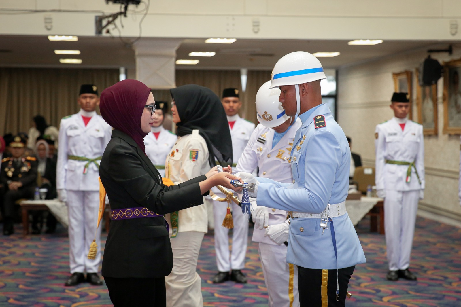 Pada prosesi pengukuhan, Wagub Jihan menyematkan lencana dan memasangkan kendit kepada Pemimpin Upacara, Flanola Felisha dari Kabupaten Tanggamus. Ia juga menyerahkan pedang kepada Komandan Paskibraka serta duplikat bendera pusaka merah putih yang akan digunakan dalam upacara pengibaran dan penurunan bendera.(Red)