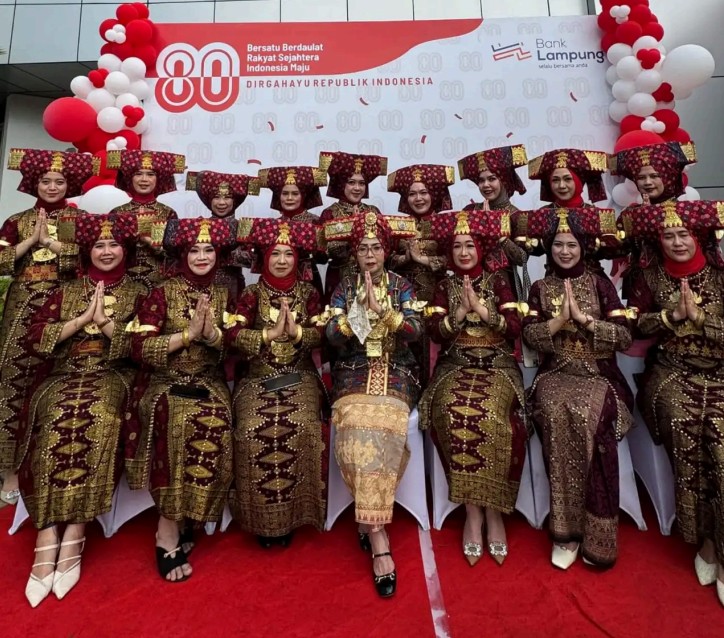 Bandar Lampung – Ikatan Keluarga Bank Lampung (IKBL) tampil berbeda dalam Upacara Peringatan Hari Ulang Tahun (HUT) ke-80 Republik Indonesia, Senin (17/8/25). Seluruh anggota IKBL mengenakan busana adat Lampung, Siger Mighul, saat mengikuti upacara di Kantor Pusat Bank Lampung.