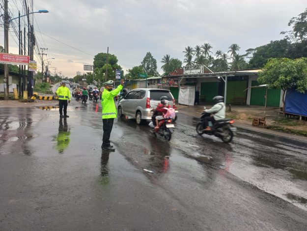 Pesawaran – Dalam cuaca hujan yang mengguyur wilayah Gedong Tataan, personel Satuan Lalu Lintas (Sat Lantas) Polres Pesawaran tetap menunjukkan dedikasi tinggi dengan menjalankan pengaturan lalu lintas di Simpang Tugu Coklat, Jalan Lintas Barat (Jalinbar) pada Sabtu pagi (20/9/2025) pukul 06.30 WIB. Meskipun hujan turun cukup deras, mereka hadir untuk memastikan kelancaran arus kendaraan dan antisipasi kemacetan di titik rawan kepadatan.
