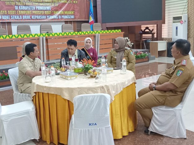 PRINGSEWU – Bupati Pringsewu Riyanto Pamungkas menerima dan menyambut ketibaan Paduka Yang Mulia Saibatin Puniakan Dalom Beliau Pangeran Edward Syah Pernong, Sultan Sekala Brak Yang Dipertuan Ke – XXIII.