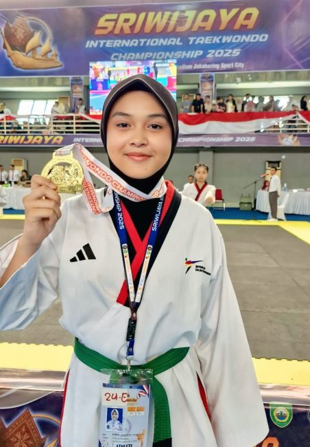 Lampung Utara -Seorang siswi SD Muhammadiyah Soekarno Hatta Kotabumi, Lampung Utara (Lampura), Rubina Alkhansa Assidiqia, berhasil meraih medali emas dalam ajang bergengsi Sriwijaya International Taekwondo Championship 2025 yang berlangsung di GOR Ranau, Palembang, Sumatera Selatan. Rubina, yang kini duduk di kelas 5 Al A’lim, tampil gemilang dan mampu mengalahkan lawan tandingnya hingga meraih Medali Emas dikelasnya.